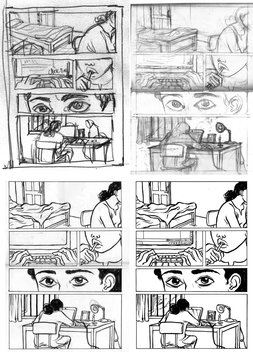 Below is how the first page of the comic took shape: From the thumbnail, to the final pencil, ink and color corrected.